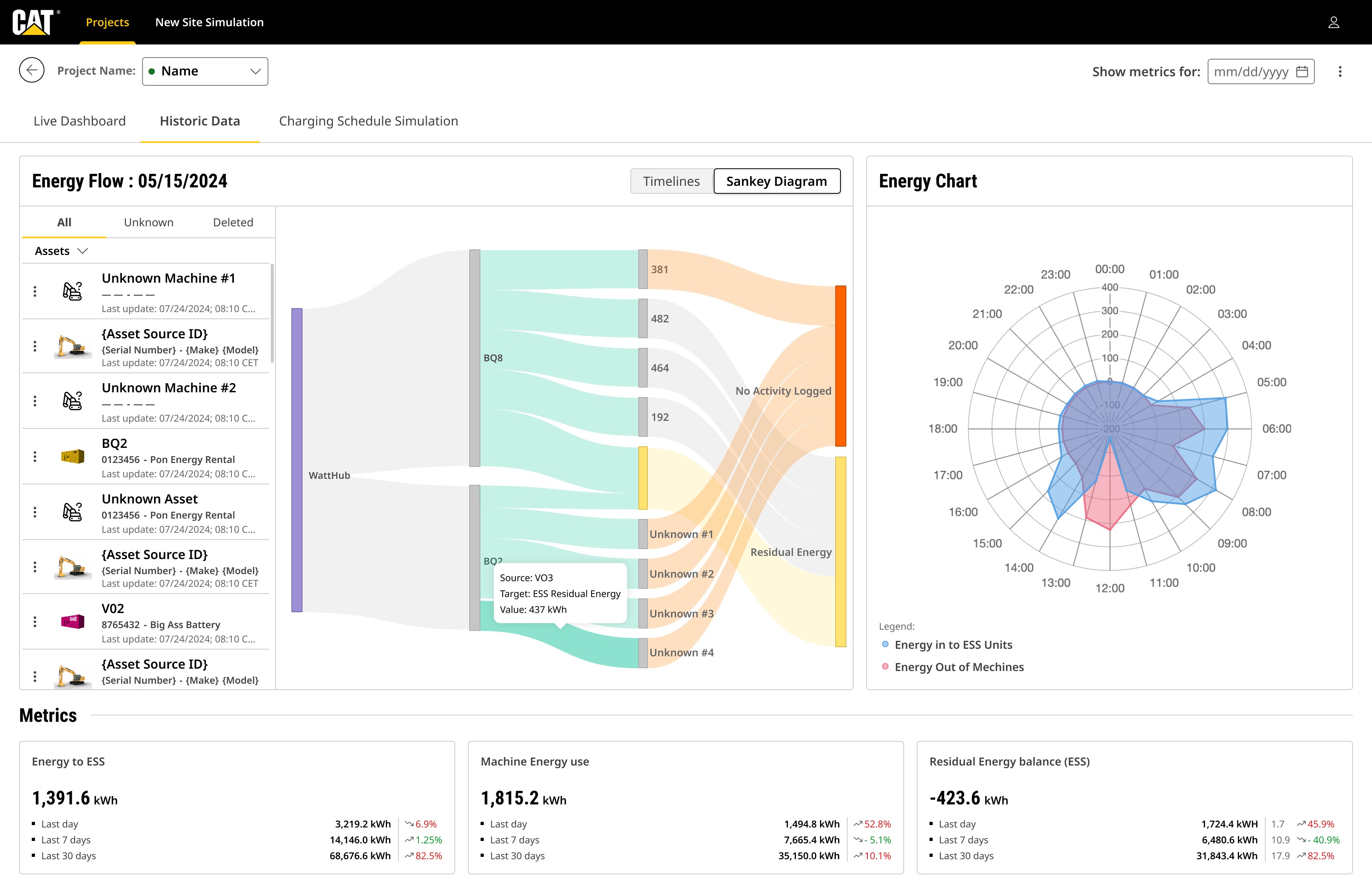 Real-time Energy In and Energy Out tracking for MEC and ESS batteries with detailed charts showing consumption patterns, charge cycles, and efficiency metrics over time.